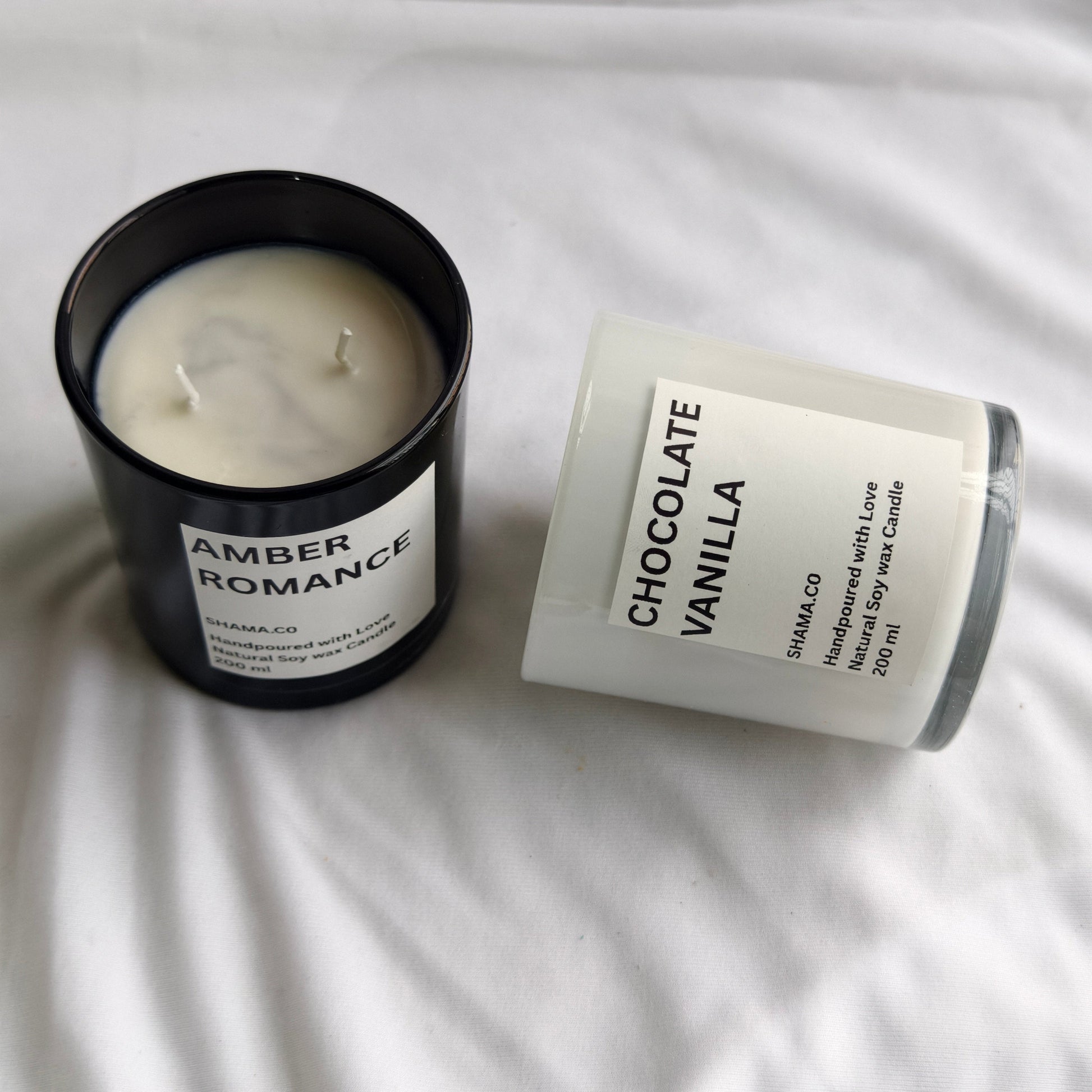 Experience cozy indulgence with our Amber Romance and Chocolate Vanilla soy candles by