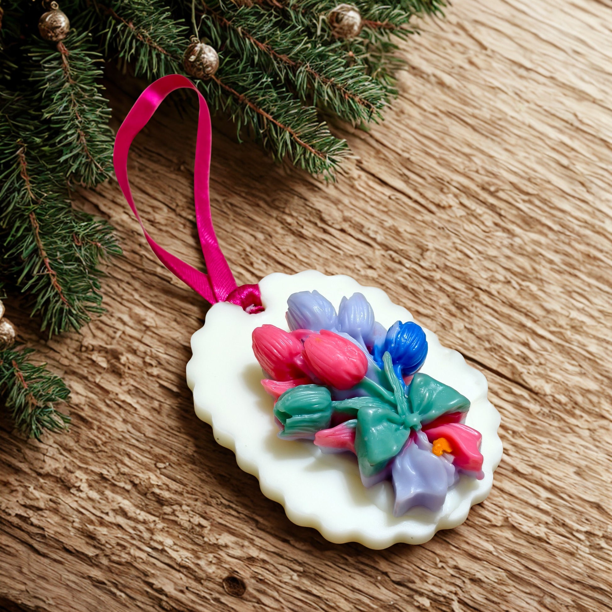 Add a burst of festive elegance to your space with this handmade wax aroma ornament, crafted to captivate both the eyes and the senses. Featuring a vivid floral relief in hues of pink, red, purple, and green, this scalloped-edge oval tag is a celebration of artistry and fragrance. Suspended by a bright pink ribbon, it’s perfect for adorning Christmas trees, wardrobes, vanities, or gift hampers.