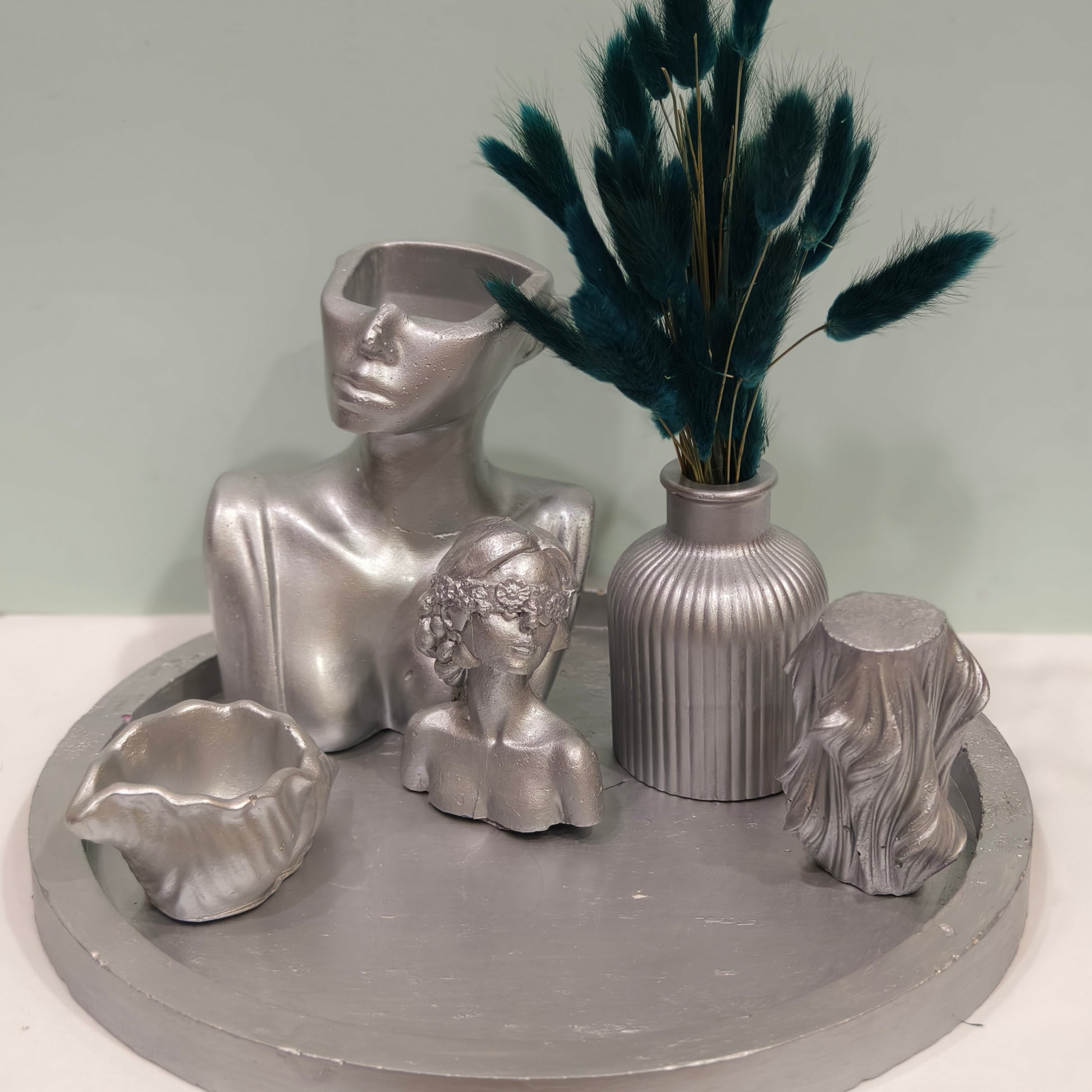 Elevate your space with the Celestial Silver Luxe Candle & Decor Ensemble—a sophisticated blend of artistry and ambiance. This curated set features a radiant silver bust, a seashell-inspired candle holder, and a sleek vase adorned with ethereal blue-tinted dried florals. Each piece is meticulously designed to evoke tranquility and modern elegance, making it the perfect centerpiece for living rooms, bedrooms, or festive gatherings. The harmonious contrast of shimmering silver and serene azure tones adds a touch of luxury and charm to any decor style. Ideal for gifting or personal indulgence, this set transforms everyday moments into visual poetry.