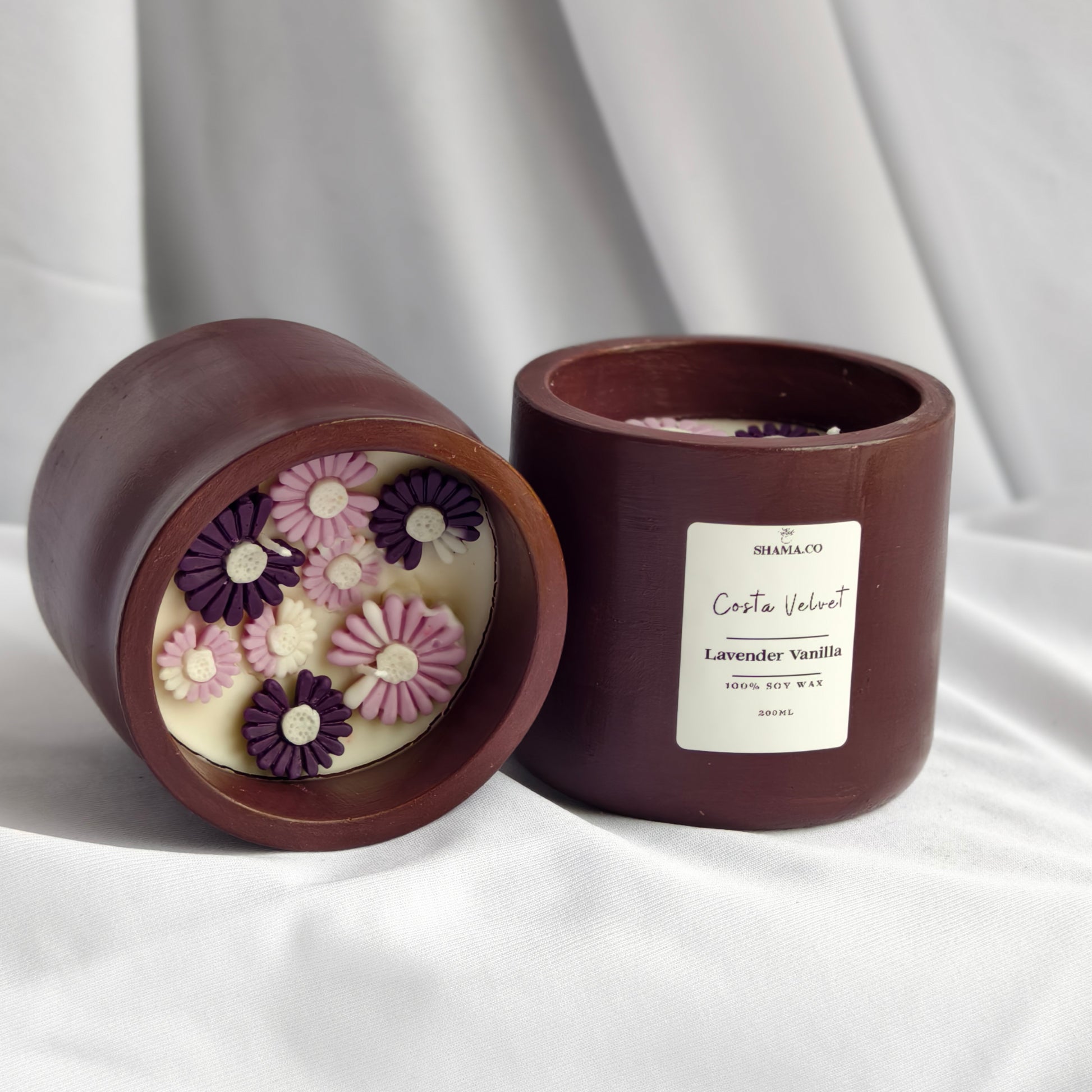 Encased in a deep maroon matte jar, this lavender vanilla soy wax candle features intricatelyhand-poured floral embeds, ofering both aromatherapy and decor. Crafted from eco-friendly soywax, it creates a calming ambiance while being sustainable and luxurious for your home.