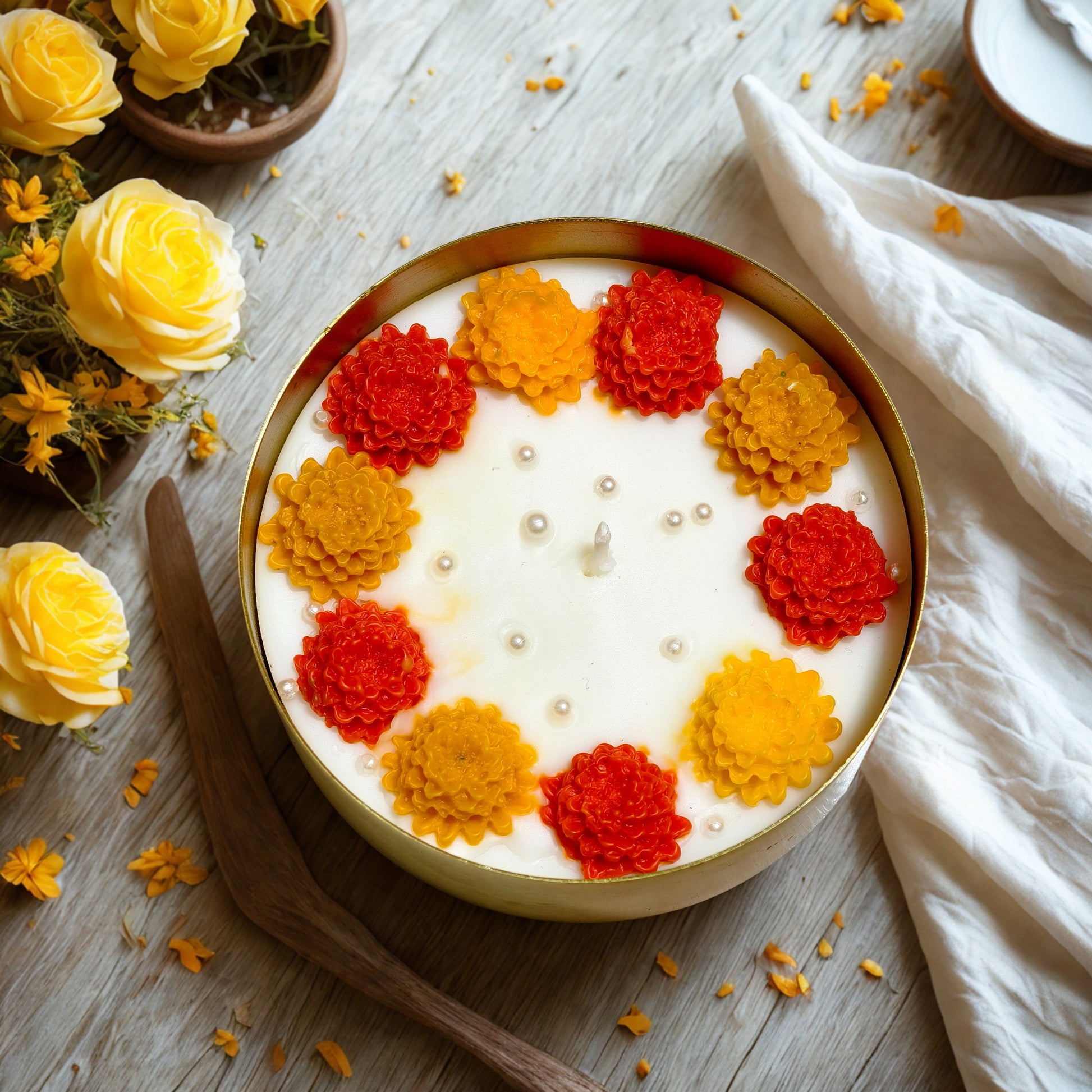 Celebrate the soul of Indian festivities with our Urli Candle, a radiant blend of tradition and artistry. Hand-poured in a luxe metallic bowl, this soy wax candle is adorned with vibrant orange and yellow marigold blooms, symbolic of prosperity and devotion. Nestled among the petals are delicate pearl accents, adding a touch of elegance to your décor.