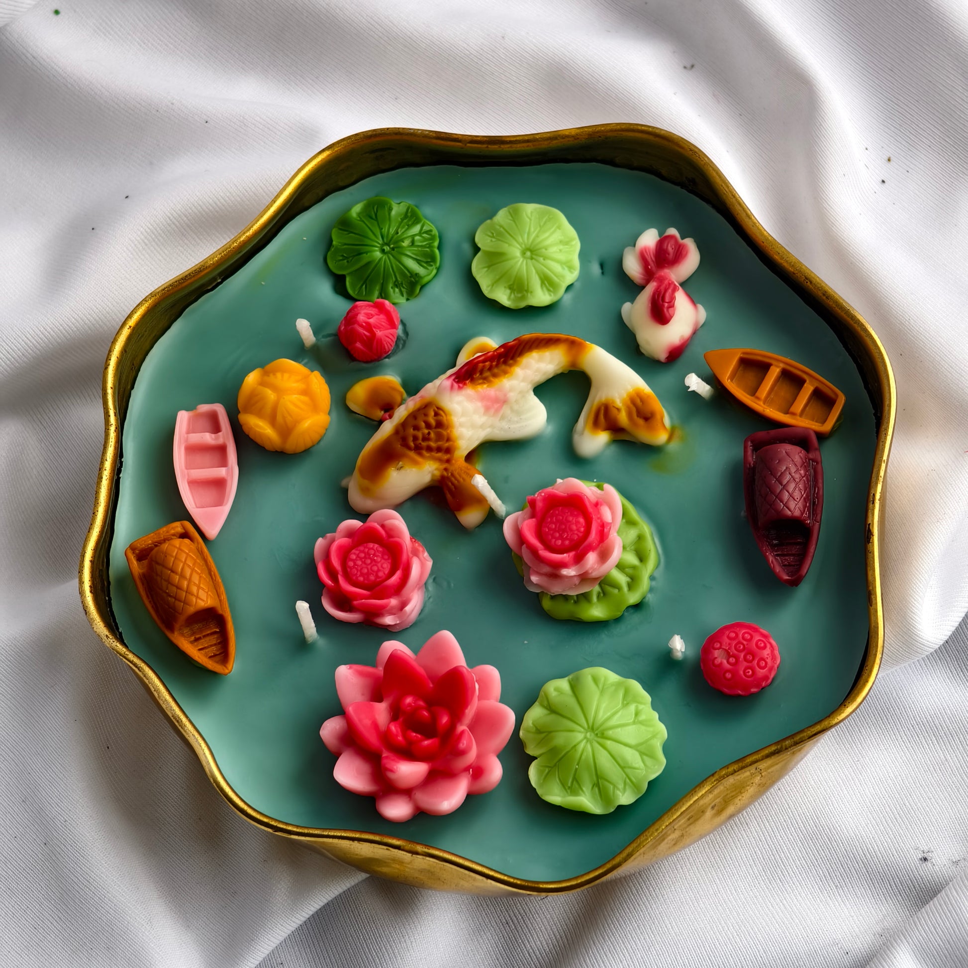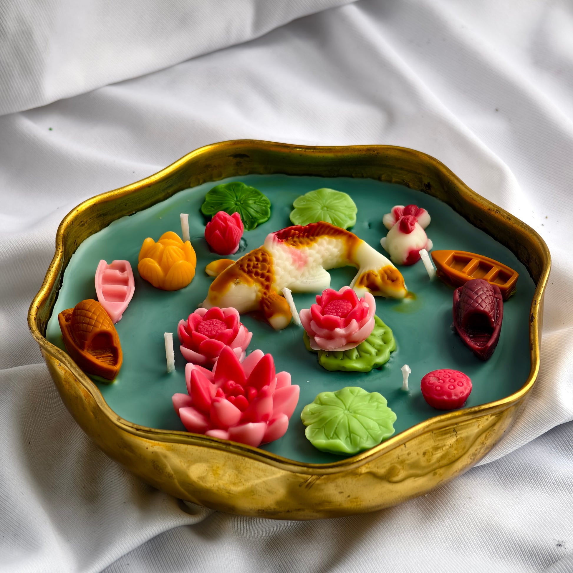 intricate fish, lotus, boats, and lily pads. This unique scented candle adds a tranquil charm to