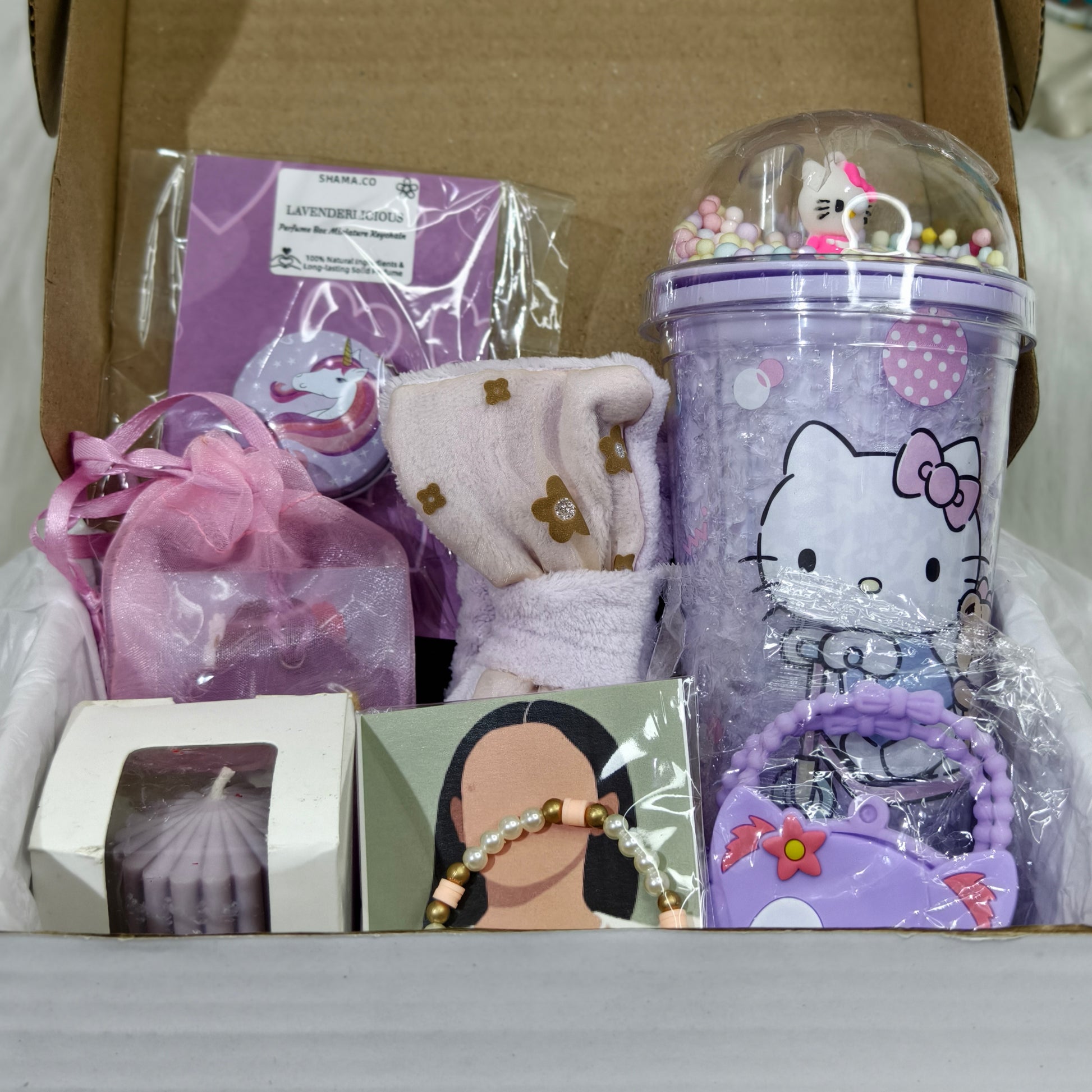 Looking for a cute and memorable gift hamper for girls? Our Lilac Love box is a bestselling Hello Kitty-themed gift set with a lavender plush tumbler, pearl bracelet, scented soy candle, Cute bow Hairband, Soy Wax Sachet and a charm pouch. Perfect for birthdays, Rakhi return gifts, and themed parties.This is among the most trending lavender gift hampers in India for little girls!