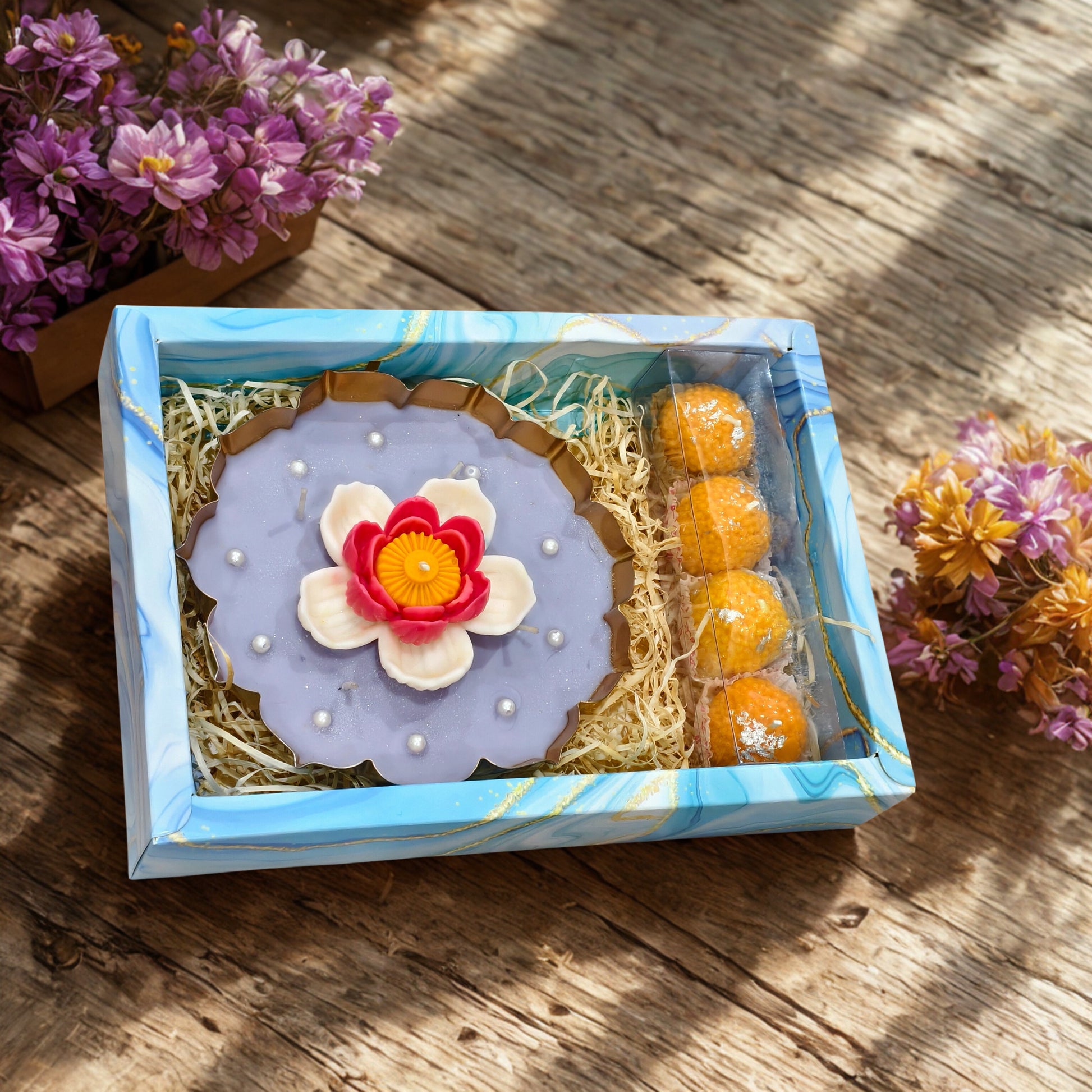 Celebrate the spirit of tradition with our handcrafted Urli & Laddu Gift Set—an exquisite blend of festive elegance and sweet indulgence. Nestled in a luxurious blue-gold box, this set features a floral Urli candle crafted from eco-friendly soy wax, adorned with pearls and vibrant petals, paired with four artisanal coconut laddus that melt in your mouth. Ideal for Diwali, Raksha Bandhan, weddings, or housewarming gifts, this collection brings together.