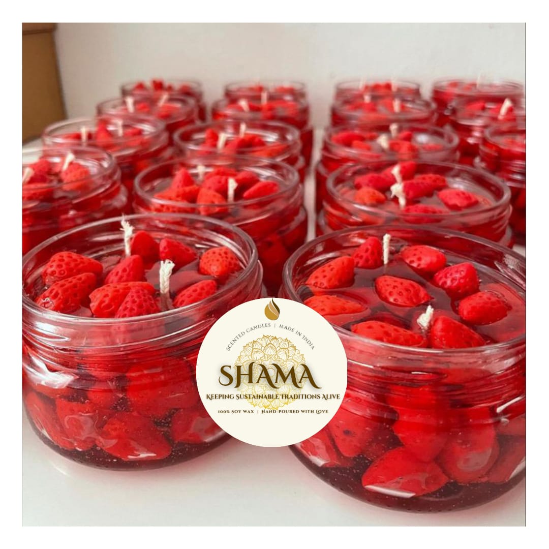 Indulge your senses with our “Strawberry Delight” candle. Crafted with care, this exquisite creation features vibrant red strawberry-shaped wax embeds suspended in a crystal-clear gel wax. Imagine a jar of freshly preserved strawberries, their sweet aroma filling the room as the flame dances. The label proudly bears our brand name, “SHAMA,” and the motto “KEEPING TRADITIONS ALIVE.” Light this candle to evoke memories of summer days and the joy of homemade fruit preserves. 🍓✨