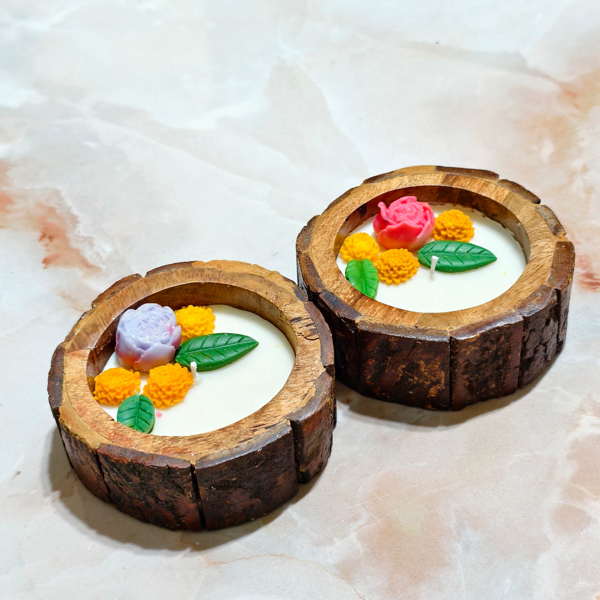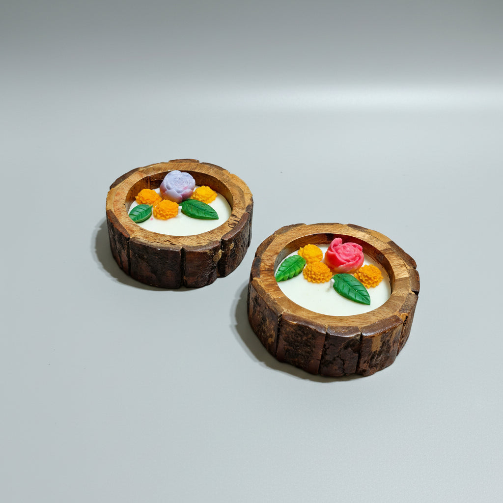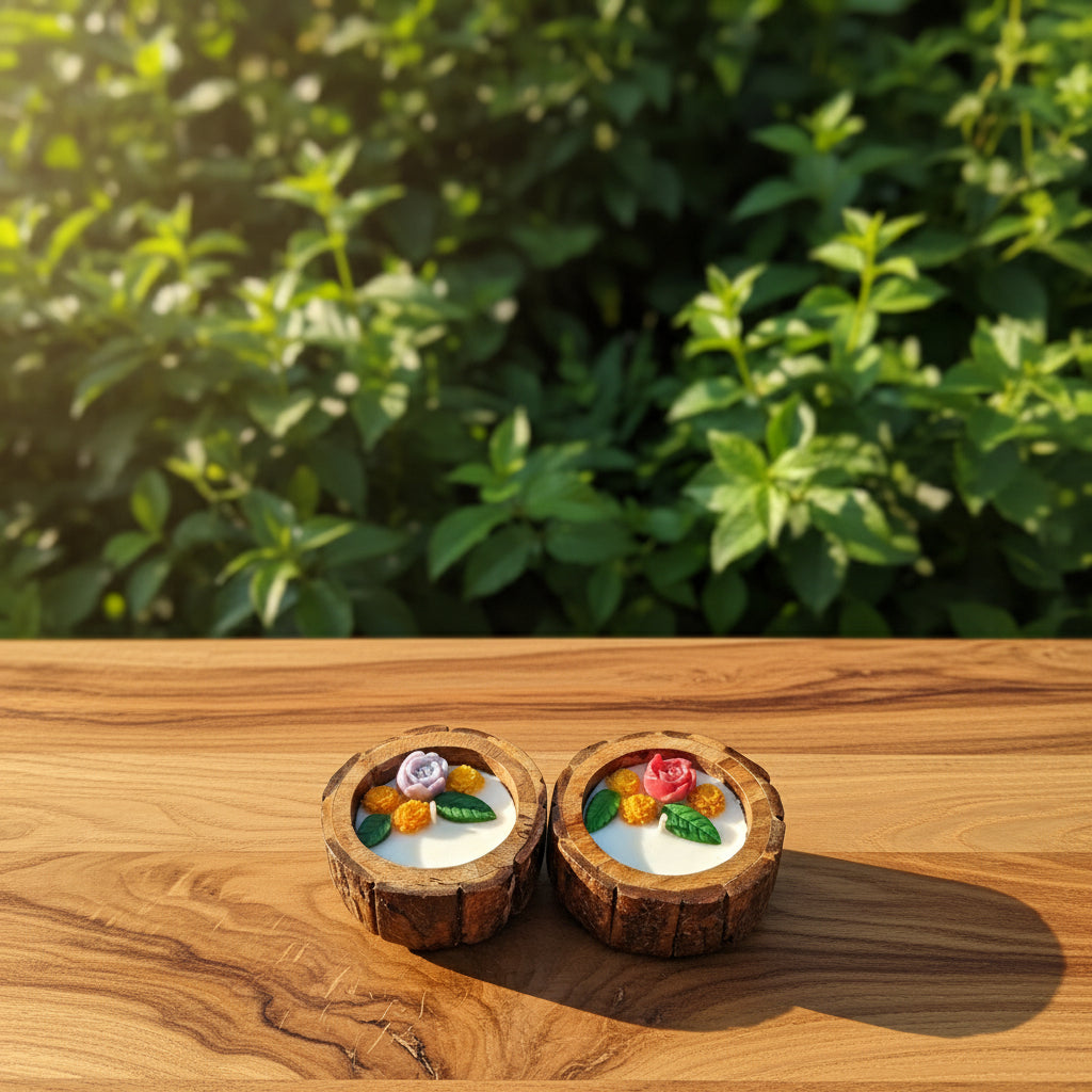 Elevate your space with the Wooden Candle Duo, a handcrafted set of two soy wax candles nestled in rustic wooden jars and adorned with sculpted floral artistry. Each candle is a celebration of nature—featuring vibrant blooms in purple, pink, red, and yellow, with lush green leaves that evoke springtime serenity.