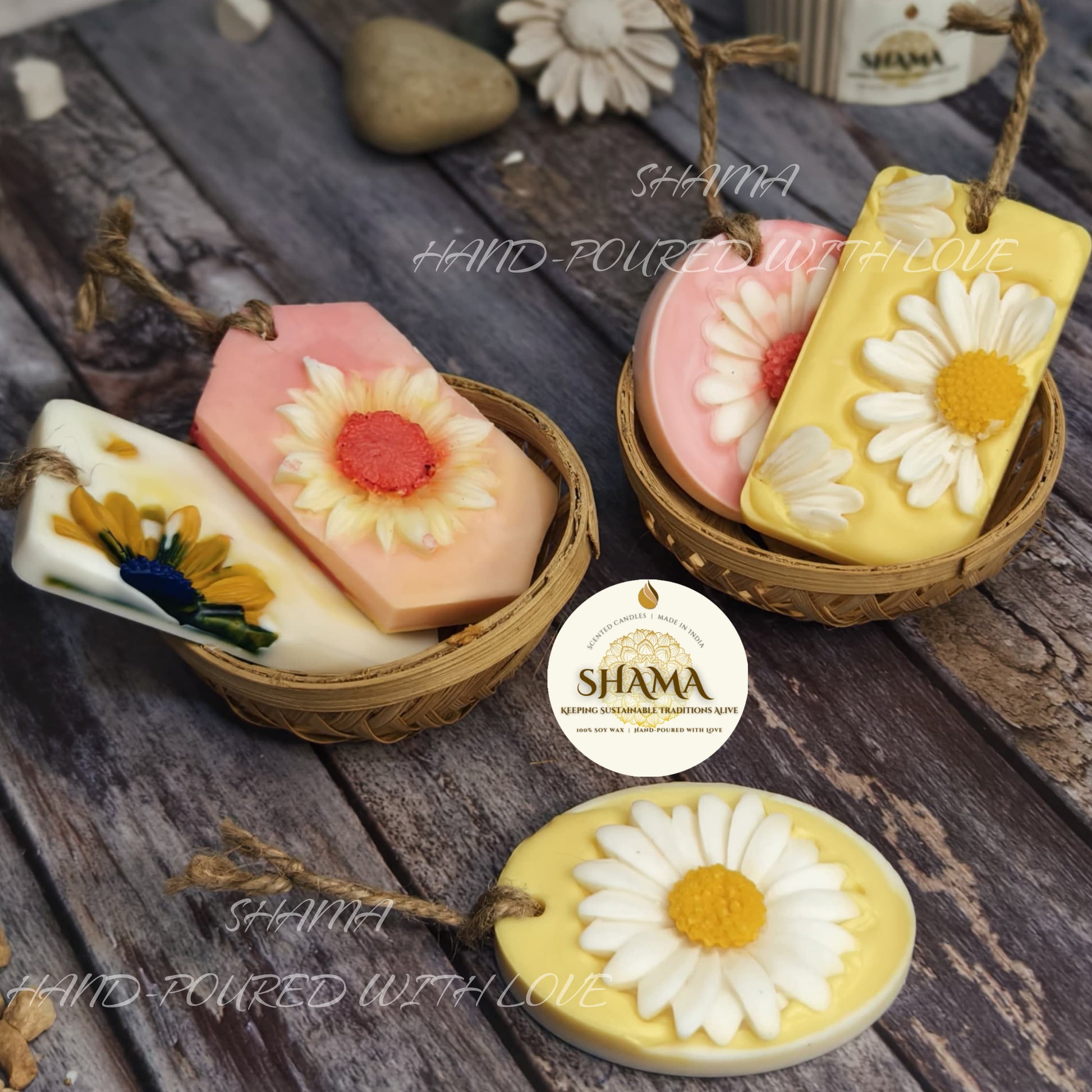Whispering Blooms Sachets are lovingly handcrafted from natural soy wax, infused with an enchanting blend of floral scents. Each sachet features delicate relief patterns of daisies and sunflowers, reminiscent of a sun-kissed garden. The pastel hues—soft pinks, creamy yellows, and gentle greens—add a touch of rustic elegance. Presented in woven baskets, these sachets are perfect for infusing closets, drawers, or any small space with warmth and fragrance. Let the whispers of nature embrace your senses.